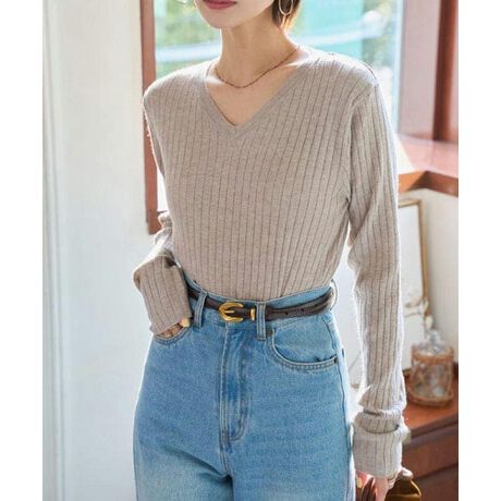 もっちりとした柔らかな肌ざわりが心地よい、太リブ×Vネックの長袖ニットトップス。