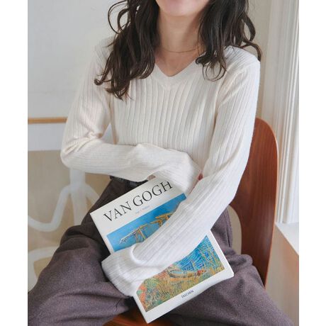 もっちりとした柔らかな肌ざわりが心地よい、太リブ×Vネックの長袖ニットトップス。