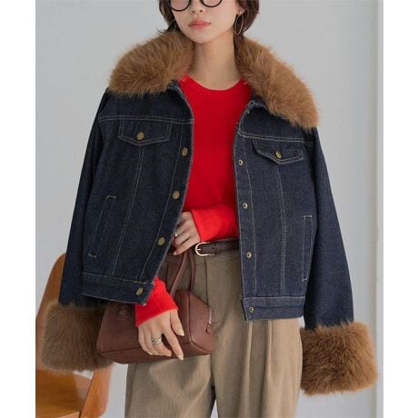 可愛く防寒叶うファー付き裏起毛デニムジャケット。