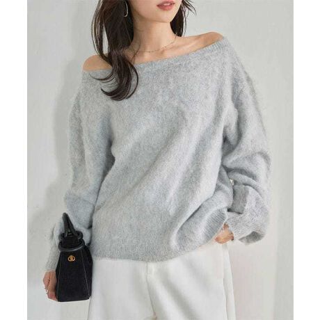 [型番:N1262]色っぽさあふれるオフショルダーニット。ふわふわなモヘアタッチの素材感が女性らしくレディさ引き立てる一枚。ネックラインを美しく魅せ、ボートネック、オフショル、ワンショル、幅広い着方を楽しめます◎【素材・サイズ感】軽くて柔らかいモヘア風ニット。モフモフの生地感が見た目にも温かくシーズンライクな表情に。ゆったりとしたサイズ感でリラックスした着心地を叶えてくれる大人フェミニンなロングスリーブニットです。#コウベレタス