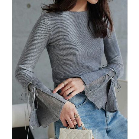 手元にそっとニュアンスを添える、リボンデザインのフレアスリーブリブニット。