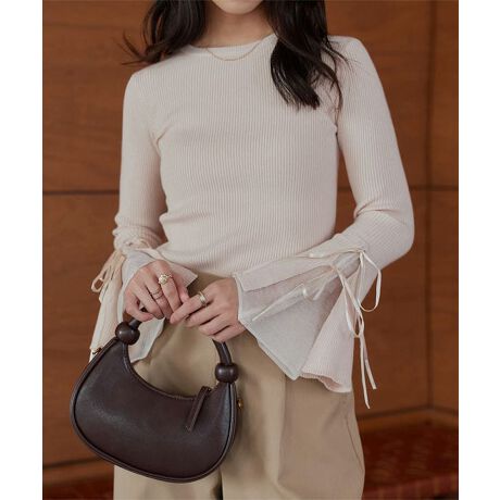 手元にそっとニュアンスを添える、リボンデザインのフレアスリーブリブニット。