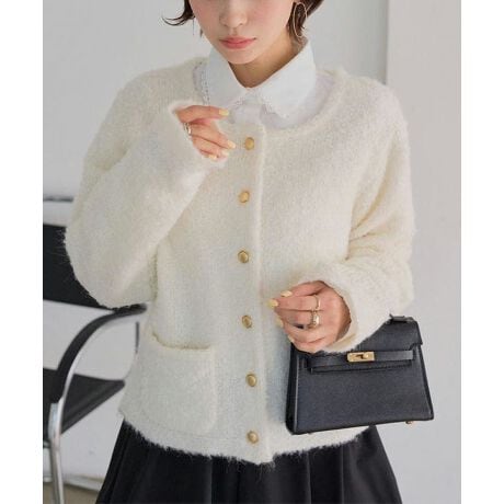 ゴールドボタンが上品さを兼ね備え女性らしく華やかに秋冬スタイルを彩ってくれるニットカーディガンです。
