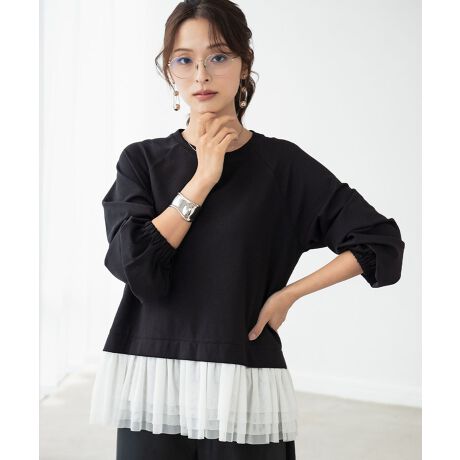 裾部分にふんだんにあしらわれたチュールが目を惹く異素材ドッキングトップス。