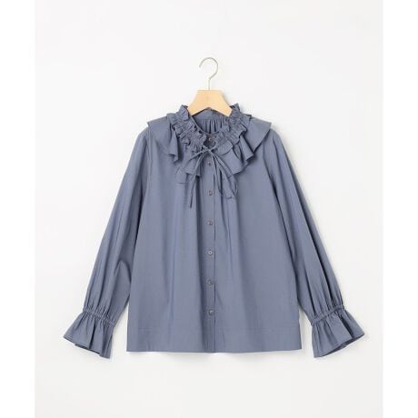 ■デザイン・フリルとギャザーをふんだんに使用した華やかな襟は釦で取り外し可能なので2WAYでスタイリングを楽しめます。・襟を取り外すとシンプルなスタンドカラーでオフィスでも対応可能です。・袖口はゴム使用のふんわりギャザー使い、レイヤードで着用の際にジャケットやニットの袖口からチラ見えする設計になっています。・1枚で着回しの効くブラウスは華やかな場面やオフィスでも大活躍するお勧めアイテムです。