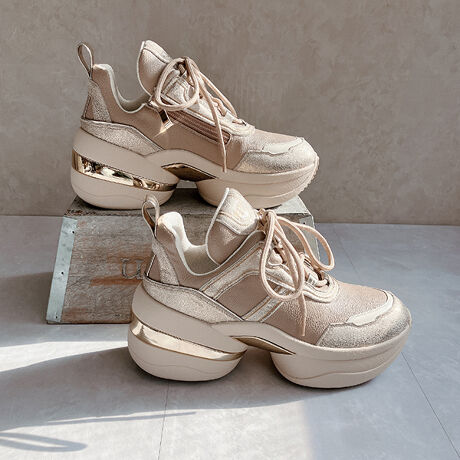 異素材を組み合わせたアッパーと、さりげなく輝くメタリックパーツが、足元にモードなアクセントを添えます。