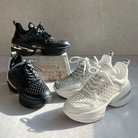 立体感のある編み込みデザインが目を惹く、モダンエレガンスな厚底スニーカー。