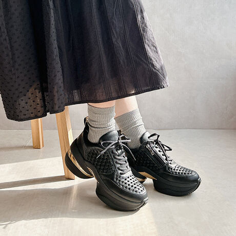 立体感のある編み込みデザインが目を惹く、モダンエレガンスな厚底スニーカー。