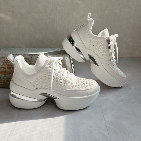 立体感のある編み込みデザインが目を惹く、モダンエレガンスな厚底スニーカー。