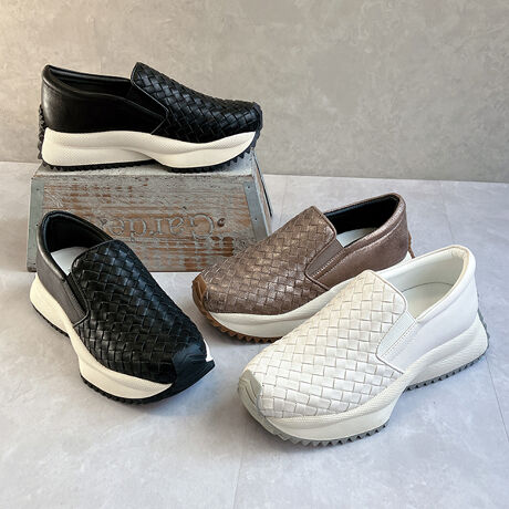 立体感のある編み込みデザインが、足元にさりげない高級感を演出するスリッポンシューズ。