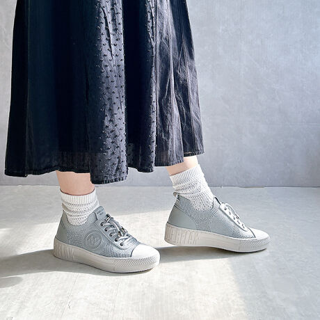 さりげなくあしらわれたロゴマークと、ゴールド・シルバー調のシューレースパーツが、シンプルな中に大人の華やかさをプラス。