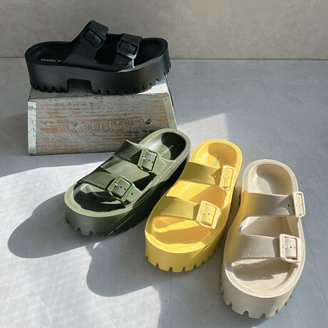 存在感のある厚底デザインが魅力の、ダブルベルトサンダル。