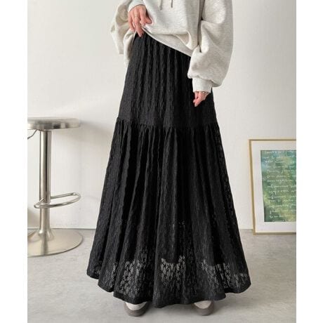繊細な柄レースにストレッチを効かせた、今季注目のティアードスカート。
