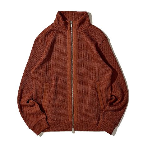 ブラック、ネイビーブルー、オレンジの落ち着きあるカラー展開。表は8ゲージ、裏は32ゲージというローゲージ×ハイゲージを組み合わせて編み上げた接結ジャージ素材により、見た目に表情を持たせながら、物性も安定したボンディングした生地のような質感を一枚の生地で実現。