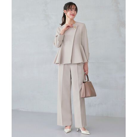 アクセント釦とラップデザインが今どきの華やかなパンツスーツ