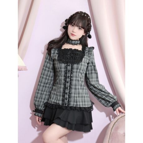 クラシカルなチェック柄とレースを重ねた、甘すぎない上品ゴシックスタイルのセットアップ。