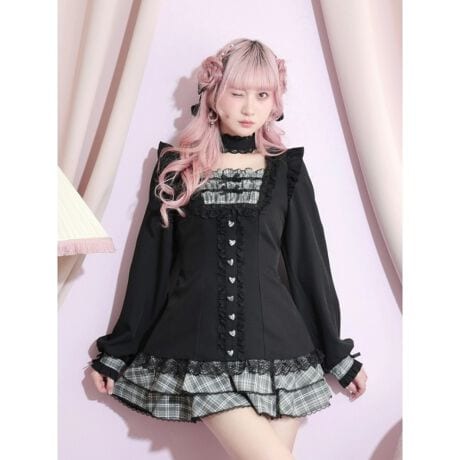 クラシカルなチェック柄とレースを重ねた、甘すぎない上品ゴシックスタイルのセットアップ。