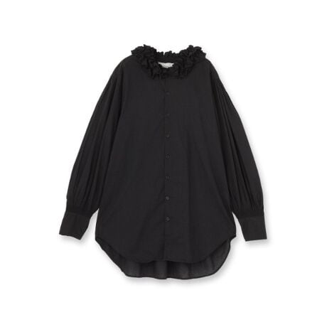 メンズのフォーマルシャツに着想した役90cmの長めの着丈に、花びらのようなフリルネックをあしらいました。
