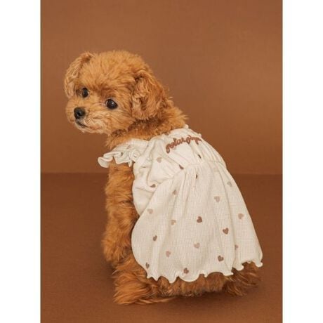 軽やかな肌触りのワッフル生地に、ちびちびハートのプリントを散りばめたガーリーなワンピースです。肩にフリル、裾にメローを入れた愛らしいシルエットで、背中にぷっくりと立体的なブランドロゴが入っています。お腹周りや肩紐にギャザーを入れているので、愛犬が動きやすく、着脱もスムーズ。色はピンクとアイボリーの2色展開です。きょうだいで色違いを揃えるのもおすすめ。同シリーズのハート型のトイとコーディネートしてお楽しみいただけます。