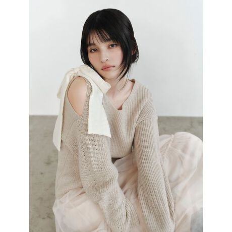 大きなリボンがコーデを華やかにしてくれるニットは、右肩のさりげない開きで上品な肌見せが叶います。