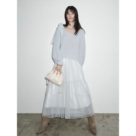 リボンがポイントのニットプルオーバーとチュールスカートがセットになったスペシャルアイテム。