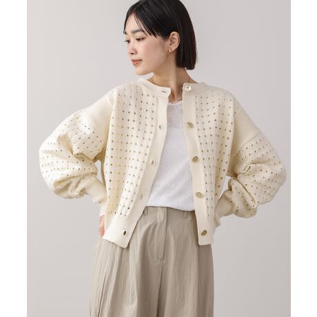前後どちらでも着られる2WAY仕様で、その日のコーデや気分に合わせてアレンジ可能。ボタンは波打つようなデザインの平型メタルで、さりげなく上品なアクセントに。袖はパフ袖でふんわり広がり、大きめアームホールが動きやすさと女性らしいシルエットを両立。身頃の両脇は片畦編みにして編み目の表情に変化をつけ、見た目にも奥行きを出しています。