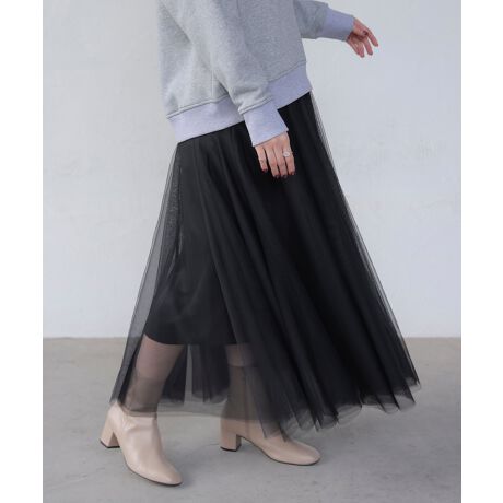 繊細なチュール素材が、装いに程よい華やかさをプラスするロングスカート。甘くなりすぎず大人の女性にも取り入れやすいデザインです。動くたびに揺れる軽やかな表情が、春らしい印象を演出します。