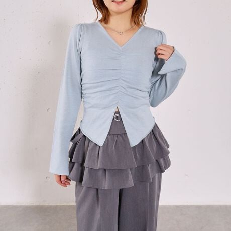 ・首のVネックと裾のVカットは抜け感をプラスするだけでなく、着やせ効果も発揮してくれます