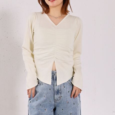 ・首のVネックと裾のVカットは抜け感をプラスするだけでなく、着やせ効果も発揮してくれます