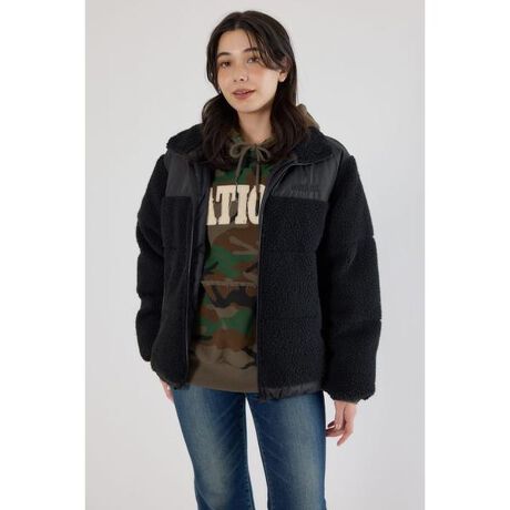 ■ポイントボアとナイロンの異素材ミックスデザインがキャッチーなジャケット。ボリュームのあるシルエットが存在感を放つアイテムです。ユニセックスでの着用が可能です。■ディテールバックにはロゴのデザインが入り、ウエスト部分にはドローコードが入るので、シルエットの変化も楽しめるのもポイントです。■スタイリングデニムやワイドパンツに合わせて、抜け感のある大人カジュアルスタイルに◎。■生地ボアと粒中綿を使用しており軽量で程よいボリューム感があります。表地のボアは毛が抜ける可能性がありますので、洗濯など取り扱いにはご注意ください。プリント箇所は着用・洗濯によリ剥離する場合があります。中綿は粒中綿を使用しています。洗濯後若干の偏りが発生する事がありますので手で整えて下さい。■透け感:なし■裏 地:あり■伸縮性:なし■光沢感:なし[注意事項]※画像の商品はサンプルです。実際の商品と仕様、加工が若干異なる場合があります。※画像の商品は光の照射や角度、お使いのモニター環境により、実物と色味が異なる場合がございます。※着用、お取り扱いの際は、アテンションタグをご確認ください。