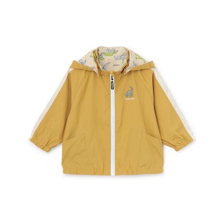 着脱式のフードがついているリバーシブル仕様のウィンドブレーカーです。表面はアンキロサウルスのワンポイント刺しゅう、裏面は恐竜たちが描かれた総柄。色数を絞ることで、統一感のあるミニマルパターンに仕上げました。袖にライン切り替えを入れたスポーティーなデザイン。撥水とUVカット機能を備えており、幅広いシーンで活躍します。内側にお名前を記入できるタグつき。