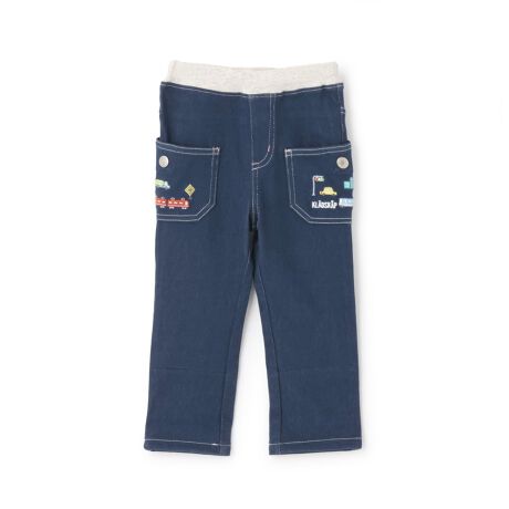 いろいろな乗り物や街の景色を刺しゅうしたロング丈のストレートパンツです。