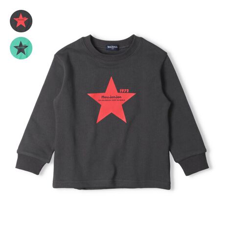 ネットショップと専門店、セレクトショップなど限定のアイテム!直営店では直営オンラインショップ「こどもの森e-shop」各店のみでの販売になります。【直営実店舗での販売はありません。】目を引く星のプリントにはmoujonjonのロゴ入り。男の子も女の子も着られるユニセックスなデザイン。秋から春まで着られる裏毛素材のトレーナー、スウェット。【アイテム】トップス カジュアル お洒落 オシャレ かっこいい かわいい 可愛い 普段着 デイリーウェア お出かけ着 お外着 お外遊び着 子ども服 こども服 男児 男の子 ボーイズ キッズ ベビーサイズ トドラーサイズ 幼稚園 保育園 小学校 通園 通学 小学生 2025年秋冬物新作 丸高衣料 ロングスリーブ 長袖 ブラック 黒色 エメラルドグリーン 薄緑色 ムージョンジョン 女児 女の子 ガールズ 男女兼用