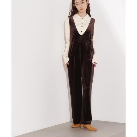 光沢感のあるベロア素材を使用したシーズンムード抜群なサロペット。深めのVネックが顔まわりをすっきり見せてくれるデザインです。ストレッチが効いたベロア素材に、程よくワイドなシルエットでリラックス感のある着心地。インナー次第で秋から春まで3シーズン着ていただけます。<素材>しっとりとした肌触りとストレッチが効いたベロア素材を使用。上品さとリラックス感を兼ね備えたベロア素材です。<詳細>仕様・開閉なし裏地・あり透け感・なし / 光沢・ややあり / 伸縮性・あり生地の厚さ・普通※モデルの着用画像の場合、光の当たり具合により、実際の色味と異なって見えることがございます。色味は、商品単体の画像をご参照ください。