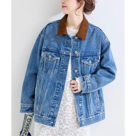 配色のコーデュロイで切り替えた襟がポイントのデニムジャケット。