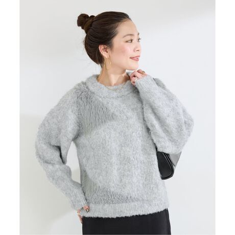 種類の違う糸を組み合わせているので、着やすくまとまり感が出るようにシンプルなモノトーンカラーにしています。一枚で着映えするニットなので、シンプルなボトムスとの相性抜群です。