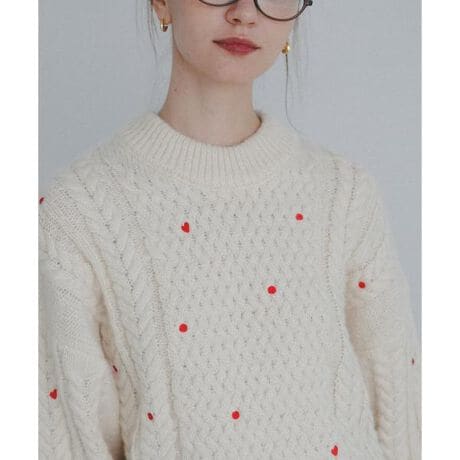 立体感のあるケーブル編みに、丁寧に施された刺繍デザインが華やかさを添えます。