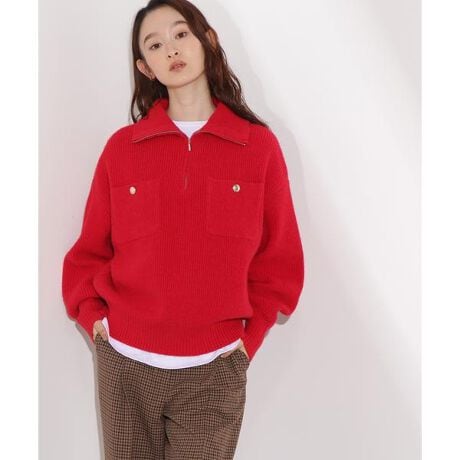 トレンド感のあるハーフジップデザインのニットプルオーバー。フロントポケットをアクセントに、ポケット中央にあしらったメタルボタンがポイントです。中にカットソーやシャツとのレイヤードもおすすめ。大きめの襟とゆとりのあるオーバーシルエットで、カジュアルな雰囲気を出したスタイルが楽しめます。<素材>ふわふわとしたタッチの糸を片畦編みでざっくりと編み立てています。<詳細>仕様・前ファスナー裏地・なし透け感・なし / 光沢・なし / 伸縮性・あり 生地の厚さ・普通※モデルの着用画像の場合、光の当たり具合により、実際の色味と異なって見えることがございます。色味は、商品単体の画像をご参照ください。