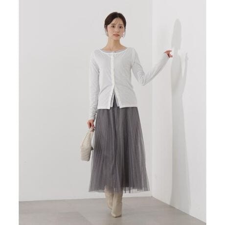 ラメ糸が入っているチュールが可愛いプリーツスカート。細かいプリーツがフェミニンな雰囲気を叶えてくれます。ウエストはゴム仕様なのではき心地の良さも嬉しいポイント。キレイめトップスと合わせるのはもちろん、スウェットを合わせたMIXスタイルもお勧めです。