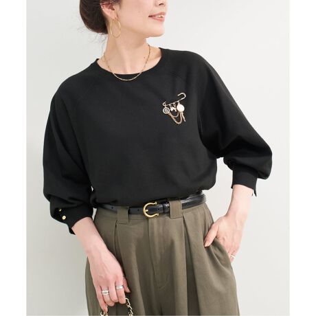 綺麗目な目面が特徴で肌触りも良く、すっきりとしたクルーネックと身体のラインを拾いすぎない程よいサイズのオンオフ着回しやすい一枚です。袖口にはゴールドの飾りボタンをあしらい、シンプルながら華やかさをプラス。複数のチャーム付きの取り外し可能なブローチが付いており、気分やシーンに合わせて表情を変えられます。