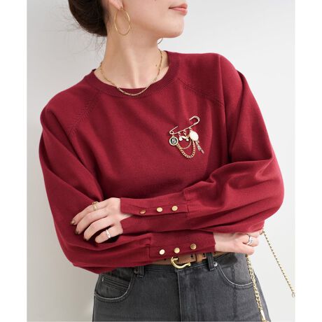 綺麗目な目面が特徴で肌触りも良く、すっきりとしたクルーネックと身体のラインを拾いすぎない程よいサイズのオンオフ着回しやすい一枚です。袖口にはゴールドの飾りボタンをあしらい、シンプルながら華やかさをプラス。複数のチャーム付きの取り外し可能なブローチが付いており、気分やシーンに合わせて表情を変えられます。