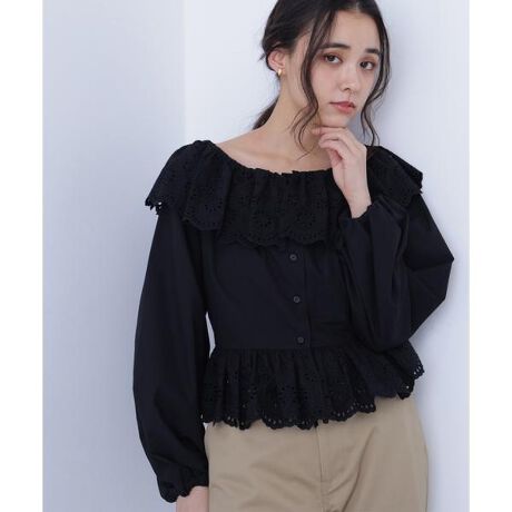 前後2WAYで着られる着回し力の高い、コンパクトなペプラムブラウス。大きな襟にあしらった繊細な刺しゅうが華やかに映えるデザインです。軽やかなコットン素材を使用しており、春らしい爽やかな印象に見せてくれます。<素材>軽いコットン素材を使用。ブラックは透けない素材、ホワイトは透けにくい素材です。<詳細>仕様・前ボタン裏地・なし透け感・ブラックは透けない素材、ホワイトは透けにくい素材 / 光沢・なし / 伸縮性・なし 生地の厚さ・普通※モデルの着用画像の場合、光の当たり具合により、実際の色味と異なって見えることがございます。色味は、商品単体の画像をご参照ください。
