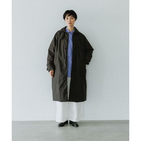 ナチュラルな風合いが魅力的なアウター。表地/身頃裏地はコットン・袖裏は滑りの良い生地を使用し、着やすい仕立てになっています。軽くて暖かいので、お仕事からお出かけまで日常使いに便利な逸品です。ウールコートのように冬のイメージが強くなく、寒さが残る春先まで長く活躍。ゆとりがあるので気温に合わせてニットを重ねられるのも嬉しいポイント。チンストラップを留めてスタンドカラーとしてもお楽しみいただけます。スリット入りで足さばきが良い仕様にも注目。ジャケットはシリーズアイテムからご覧ください。