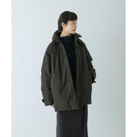 ナチュラルな風合いが魅力的なアウター。表地/身頃裏地はコットン・袖裏は滑りの良い生地を使用し、着やすい仕立てになっています。軽くて暖かいので、お仕事からお出かけまで日常使いに便利な逸品です。ウールコートのように冬のイメージが強くなく、寒さが残る春先まで長く活躍。ゆとりがあるので気温に合わせてニットを重ねられるのも嬉しいポイント。チンストラップを留めてスタンドカラーとしてもお楽しみいただけます。ロング丈はシリーズアイテムからご覧ください。