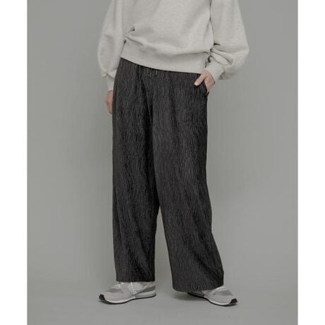 暖かみのあるタッチが特徴のベロアカットソー生地に繊細なプリーツ加工をかけたイージーパンツ。