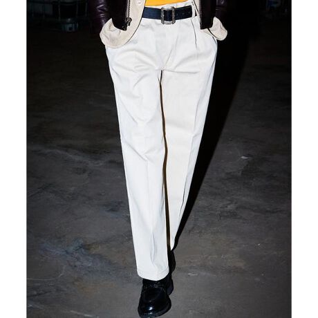 裾に向かって緩やかにテーパードをかけることで、ワイドでありながらストンと落ちる端正なワイドストレートを形成しています。