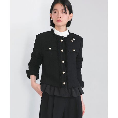 定番のツイード素材に異素材のフリルのアクセントが大人かわいいジャケット。