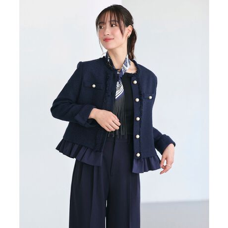 ・定番のツイード素材に異素材フリルのアクセントが大人かわいいジャケット。