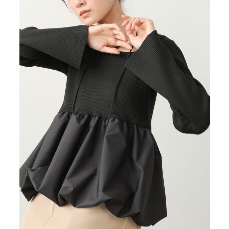 本体はポリエステル100%のニット素材を使用し、軽やかで扱いやすい着心地に。別地部分にはポリエステル×綿混素材を使用し、ふんわりとした立体感のあるペプラムシルエットを演出します。異素材切替による表情の違いが、シンプルながらも奥行きのある印象に。