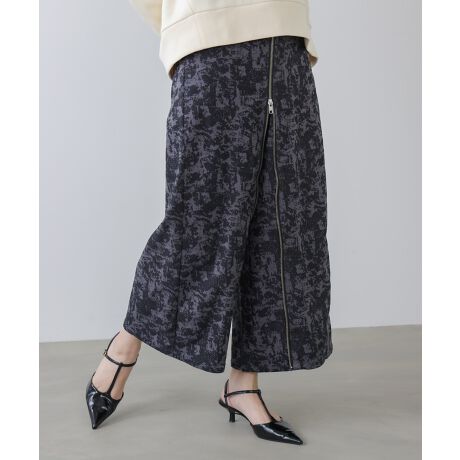 前から見ると、まるでスカートのようなシルエットに見える、アソート柄ZIPパンツ。